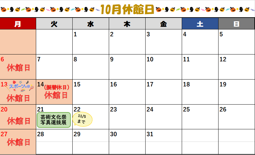 14日(火)は13日(月)の祝日の振替により休館日です。